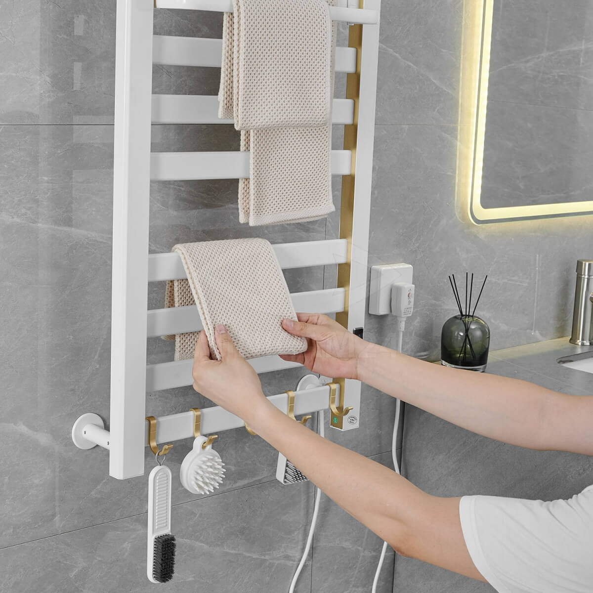 Полотенцесушитель электрический Loder 49*96 см с вешалкой - это стильное и функциональное решение для вашей ванной комнаты. Размеры составляют 480 мм (ширина) х 960 мм (высота) х 220 мм (полка) х 100 мм (от стены). Он имеет степень водонепроницаемости IPX4 и может быть подключен справа. Длина шнура питания составляет 150 см. Вы можете регулировать температуру от 35 ℃ до 60 ℃. Гарантируется безопасность использования благодаря замкам безопасности для детей и постоянной температуре.